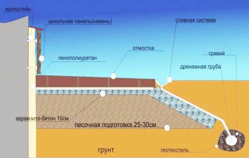 С наружной части дома по всему периметру для защиты фундамента необходимо выполнить достаточно широкую отмостку из бетонной смеси. Для избегания разрушения фундамента и цокольной кладки, заглубленной в почву, их обязательно нужно защитить снаружи с помощью специального рулонного гидроизоляционного материала, предварительно разогретого и приплавленного к материалу строительной конструкции.