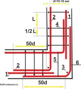 К армированию в углах надо подходить с особым вниманием, потому что эти участки самые нагружаемые, в них образуются разряжения высокой величины. Поэтому соединение арматуры в них производится по специальным схемам, в которых часть элементов конструкции в одной траншеи заходит в соседнюю с перехлестом сопряженных концов. Чтобы было понятно, о чем идет речь, вот несколько фотографий, на которых обозначены возможные способы соединения двух смежных участков армирующего каркаса.