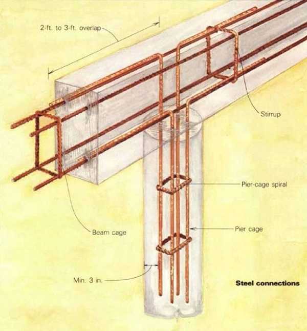 Во всех случаях закрепление ленты и опоры выполняется с помощью выпуска арматуры. При этом каркас вяжут так, чтобы два прута соединяли сваю с нижним поясом, а два с верхним. Присоединение только к нижнему ряду — неправильное. Армирование на углах и местах примыкания стен выполняется так же, как для ленточной конструкции.