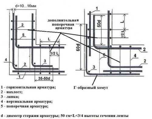 Обратите внимание, что в этих двух схемах четко определены различия. Если в первой перехлест и соединение двух каркасов происходит за счет продольной арматуры, которую сгибают и направляют в соседнюю траншею, то во второй связка производится Г — образным хомутом, изготовленным из той же арматуры, что и продольные элементы армирующего каркаса.