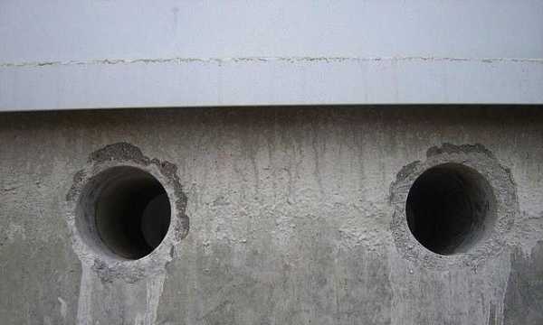 Иногда сквозные проёмы в бетоне делают с помощью деревянных чурок, которые устанавливают в опалубку перед заливкой раствора. Так делать нельзя! Деревянные элементы после застывания бетона вынуть очень трудно. Их приходится выбивать, прилагая достаточное усилие, при этом повреждается целостность самого фундамента.
