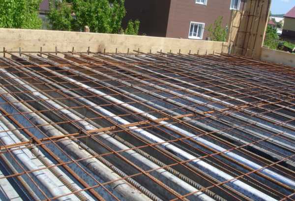 Для армирования перекрытия используется металлический прут, уложенный сеткой. Шаг линий определяется проектом. Пруты скрепляются и приподнимаются над слоем профнастила с помощью пластиковых фиксаторов.