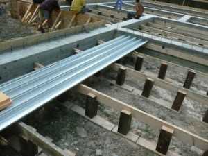 Несъемная опалубка выполненная из профнастила имеет достаточно жесткости, чтобы стать отличным основаниям, ее укладывают на металлические балки перекрытий. Основанием из профлиста является опалубкой и выполняет армирующие задачи. Профлист с легкостью разрезается на нужные детали, тем самым из него можно смонтировать любую опалубку.