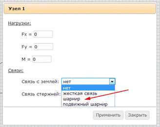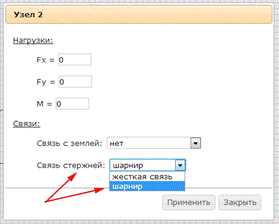 Для всех оставшихся промежуточных узлов в пункте Связь стержней выбираем Шарнир, например, узел 2 (рис. 38).