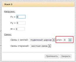 В результате данной операции на чертеже в узле 1 появится неподвижный шарнир (рис. 36). Чтобы задать в узле В подвижный шарнир (рис.16), в разделе Элементы выбираем Узел 3 ив пункте Связь с землёй выбираем Подвижный шарнир. В случае подвижного шарнира существует возможность регулирования угла наклона опорной поверхности (рис. 37).