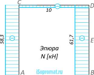 Продольную силу NII здесь вызывает горизонтальная реакция HA, которая сжимает ригель.