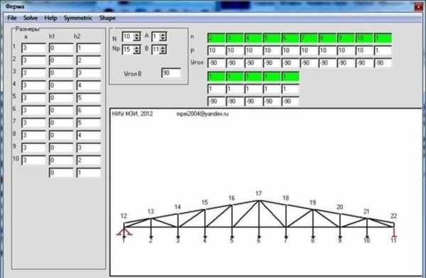Небольшая программа Ферма позволяет рассчитать плоскую статически определимую ферму и сохранить результаты. Для начала работы необходимо задать геометрические параметры фермы (размеры стержней, высоты, положения раскосов, нагрузки).