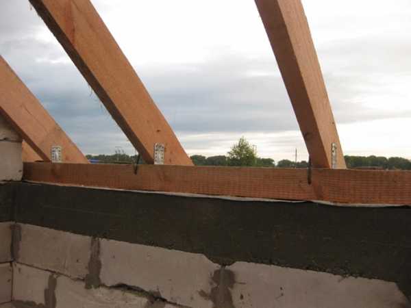 - если стропила расположить непосредственно на газобетон, то даже небольшое отклонение уровня кровли от расчетного приводит к возникновению точечной нагрузки с возможными последствиями для пеноблоков. Укладка мауэрлата на армопояс предупредит возникающие при строительстве осложнения.