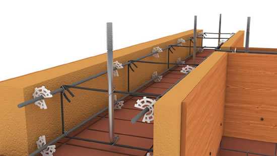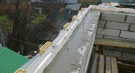 Для сведения к минимуму теплопотерь в местах соединения бетона и стен делают несъёмную опалубку. Для её создания используют U-образные блоки из того же материала, что и стены.