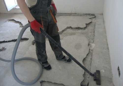 - Трещины и выбоины по высыхании пола продувают бытовым пылесосом.