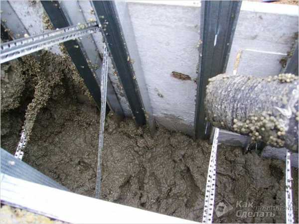 - После выгрузки в опалубку раствора, его необходимо хорошо уплотнить, чтобы стены получились без пустот.