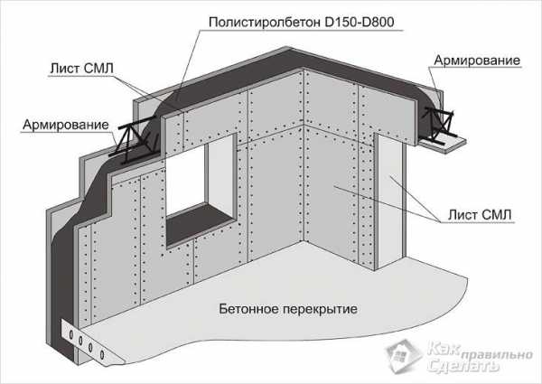 - потолочное перекрытие делают из специальных полистролбетонных панелей или также методом заливки. Стяжка пола выполняет стандартными способами;