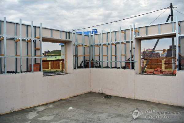 - Если укладываются блоки со сквозными пустотами, тогда обязательно необходимо выполнять вертикальное армирование. Для этого в углах устанавливается по два элемента металлического каркаса. Он продлевается по ходу продвижения и будет соответствовать полной высоте. По всей протяженности стены вставляются пруты металлической арматуры.