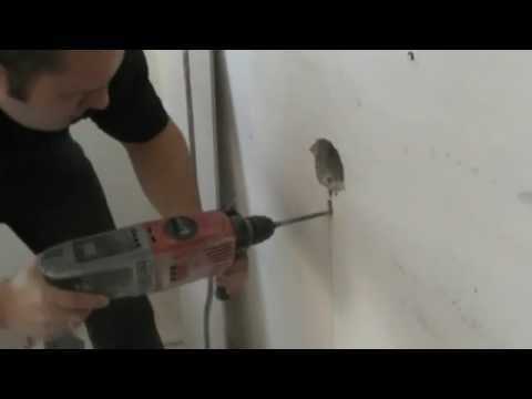 Штроба для электропроводки — видео урокДля начала рассмотрим процесс работы с перфоратором. В первую очередь на него устанавливается бур того же диаметра, что и требуемая ширина штробы. Инструмент переводится в комбинированный режим сверления и удара, и с его помощью по всей намеченной линии делаются отверстия. Расстояние между ними должно быть минимальным. Затем бур нужно сменить на специальную пику, а инструмент перевести в режим удара. Все отверстия соединяются между собой, и получается хоть и не очень аккуратная, но вполне пригодная для закладки кабеля штроба. Главный недостаток такого способа состоит в том, что восстанавливать стены после закладки кабеля очень сложно, так как при работе с перфоратором около штробы могут откалываться большие куски штукатурки. Стоит также отметить, что такой способ не подходит для штробления монолитных стен, а также плит, сделанных их тяжёлого бетона.