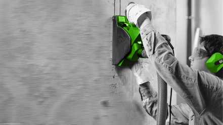 И, наконец, работа со штроборезом. Этот инструмент во многом схож с обычной болгаркой, однако, в отличие от неё, оснащён сразу двумя дисками, которые одновременно выпиливают обе линии. Как правило, такой инструмент работает вместе с промышленным пылесосом, что максимально возможно уменьшает количество пыли. После того, как линии прорезаны, оставшийся между ними бетон удаляется всё тем же перфоратором.