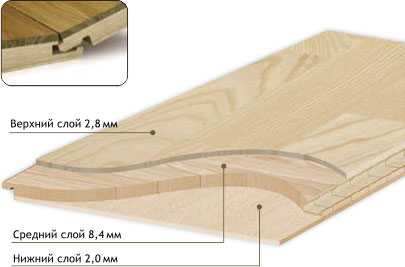 Паркетная доска Синтерос Ясень Нордик — это трехслойная конструкция, все слои выполнены из натурального дерева. Толщина верхнего слоя из ценной древесины ясеня — 2,8 мм, чего достаточно для нескольких шлифовок в случае необходимости. Средний и нижний слои выполнены из хвойных пород. Слои взаимоперпендикулярны друг другу, что обеспечивает устойчивость и стабильность паркета при укладке бесклеевым способом.