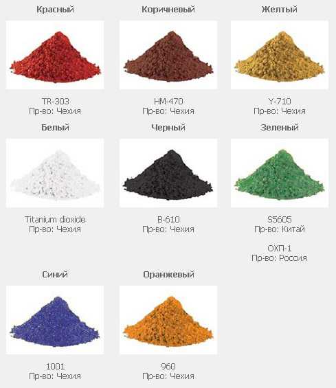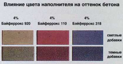 Для черных и коричневых пигментов более характерны нижние пределы приводимых цифр. Для желтых, зеленых и, особенно, синих — верхние. Для красных бетонов более характерны средние величины из приводимого диапазона.