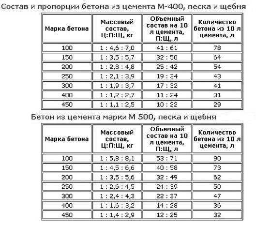 Таблица пропорций компонентов бетона при использовании