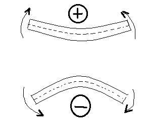 Положительно Q вращает по часовой стрелки элемент dx относительно любой точки внутри его. При вычислении внешняя сила вращающая отсеченную часть по часовой стрелки относительно центра тяжести поперечного сечения разреза любой точки внутри дает положительную внутреннюю силу