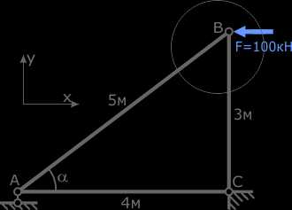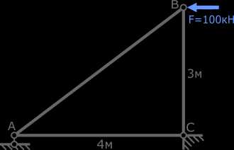 Стержневая система, состоящая из трех стержней (AB, BC и AC) соединенных между собой шарнирно, нагружена сосредоточенной силой F=100кН приложенной горизонтально в точке B.