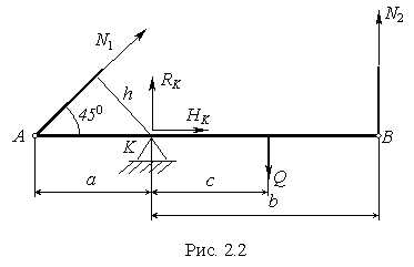 Статическая сторона задачи. По условию задачи необходимо определить усилияN 1 иN 2 , a в определении реакцийН К иR К нет необходимости. Поэтому достаточно из трех возможных уравнений равновесия использовать одно, в которое не входили бы реакцияН К иR К . Таким является уравнение суммы моментов всех сил относительно шарнираК :