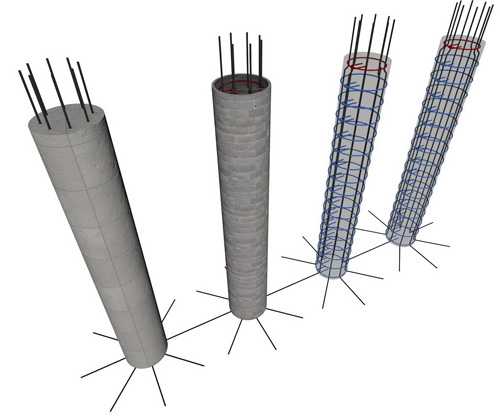 - монолитные железобетонные колонны – арматурная конструкция изготовляется на строительной площадке, после чего заливается бетонной смесью;