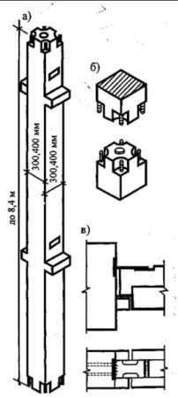 а — общий вид колонны длиной на два этажа; б — стык элементов; в — стык колонны с ригелем