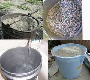 Материал изготавливается при помощи специального устройства – бетономешалки. Необходимо постоянное помешивание раствора. Для этого рекомендуется использовать лопату. Чтобы предотвратить появление в растворе пузырьков воздуха, нужно использовать специальный вибрирующий аппарат.