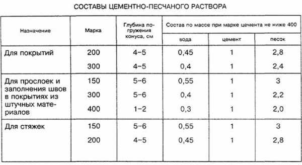 Соотношение компонентов для приготовления цементно-песчаной смеси