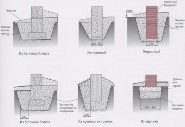 Существует большое количество типов столбчатых оснований мелкого заложения. В зависимости от материалов, из которых они изготавливаются, фундаменты бывают: