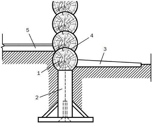 Столбчатый фундамент в виде деревянных стульев: 1 – бревенчатая стена; 2 – деревянный столб; 3 – отмостка; 4 – слой гидроизоляции; 5 – пол.