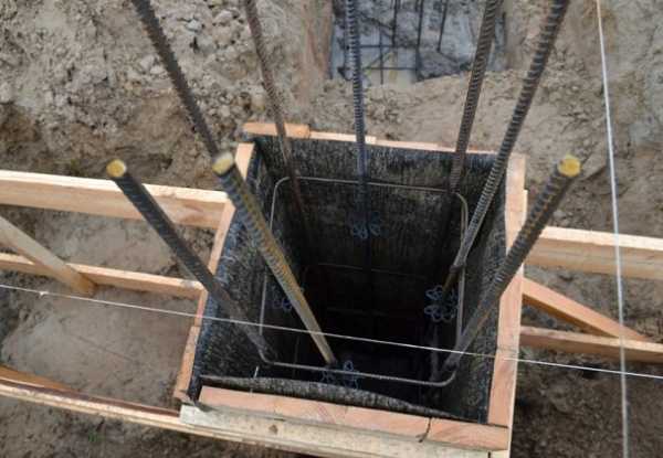 Устанавливается опалубка, проверяется на вертикальность и закрепляется. Подготовленная из арматуры и проволоки конструкция вставляется в опалубку таким образом, чтобы расстояние между арматурой и стенкой опалубки было не менее 5 см. Над уровнем опалубки арматура должна выступать минимум на 10-15 см. Впоследствии эти свободные концы послужат связкой для закрепления арматуры ростверка. Количество стержней арматуры — не менее трех. Достаточное поперечное сечение монолитной опоры — 40х40 см. Высота выбирается в индивидуальном порядке на стадии проектирования. Ростверк может практически лежать на земле, внешне напоминая ленточный фундамент, или поднят на целый м или более.