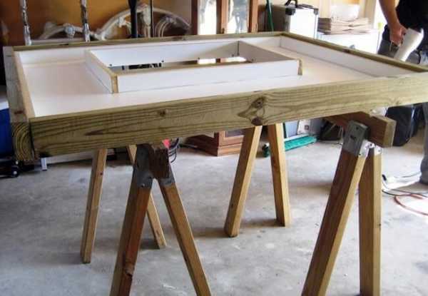 1. Монтаж каркаса. На ровную гладкую доску прикрепите бортики – таким образом, вы получите форму для будущей столешницы. Бортики легко изготовить из деревянных брусьев небольшого диаметра.