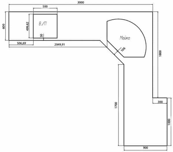 Если нужна столешница со скругленными углами, поступают следующим образом: