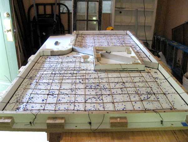 Готовый раствор заливается в опалубку, где равномерно распределяется по всему объему формы. Составляющая, которая определяет дополнительную прочность столешницы — это армокаркас. В качестве него используют металлическую сетку с небольшими ячейками, которую укладывают в середину заливаемого бетонного раствора. Заливается один слой, выравнивается, укладывается армирующий каркас, затем заливается следующий слой до уровня толщины столешницы.