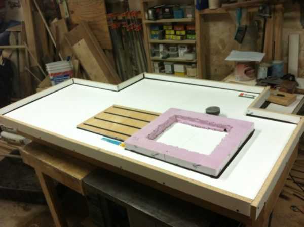 Далее к каркасу прикрепляем лист пенополистерола. Именно этим материалом мы формируем размеры и форму столешницы. Расстояние между краями будет равняться ширине стола.