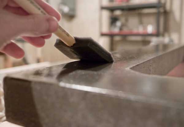 Добросовестно отшлифованная бетонная столешница уже выглядит замечательно. Но ее еще нужно обработать водоотталкивающей пропиткой для бетона – это защитить ее не только от впитывания влаги, но от загрязнения жирами. Сегодня в строймаркетах можно приобрести специальное средство – порозаполнитель для бетонных столешниц. Если обработать бетонное изделие этим препаратом, по своим эксплуатационным характеристикам оно становится равным граниту.