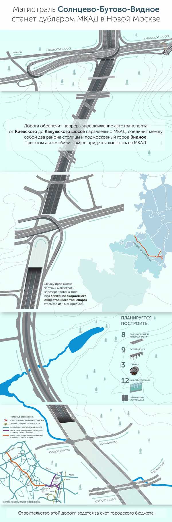 «Сейчас находимся на строительстве первого участка дороги Солнцево — Бутово — Видное, соединяющей Киевское и Калужское шоссе. Работы идут полным ходом. В рамках проекта будет построено более 20 км дорог, девять путепроводов, три тоннеля. Запланировано ответвление дороги в сторону «Саларьево» для обеспечения проезда к метро», — сказал Сергей Собянин.
