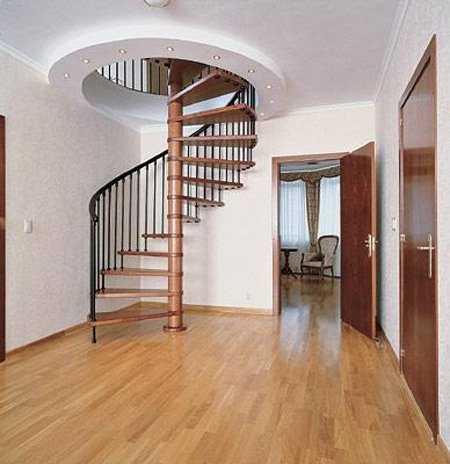 Винтовая лестница имеет более сложное устройство. Она используется в условиях ограниченного пространства, когда из-за нехватки площади не получается обеспечить безопасный уклон обыкновенной лестницы. К основным недостаткам можно отнести не слишком удобную конструкцию, которая затрудняет подъем и не позволяет переносить крупногабаритные предметы. Вместе с тем искусно выполненная винтовая лестницы обладает достаточной прочностью и может быть главным элементом интерьера.
