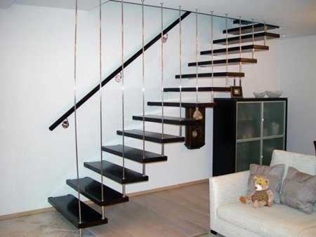 - Лестницы на тетивах имеют две боковые балки, к которым крепятся ступени. Такие белки (тетивы) могут быть изготовлены из металла или дерева. Они могут крепиться к стене или специальным опорам, обеспечивающим высокую прочность всей конструкции.