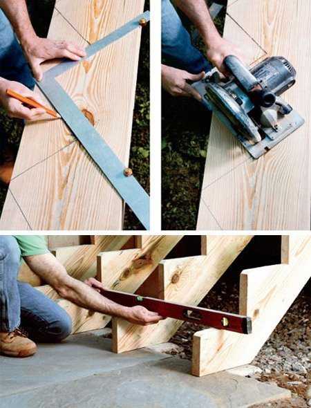 Опалубка для ступеней крыльца бетонного делается из толстых досок. Сбивается она так: