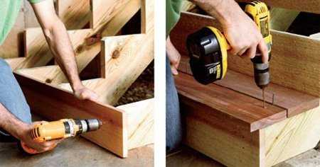 Ступени могут крепиться как непосредственно к косоурам, так и при помощи дополнительных деревянных элементов — кобылок. Отмерьте и вырежьте из дерева необходимое количество ступеней и подступенек, при этом не забудьте учесть выступ. Ступени крепятся при помощи гвоздей или саморезов.