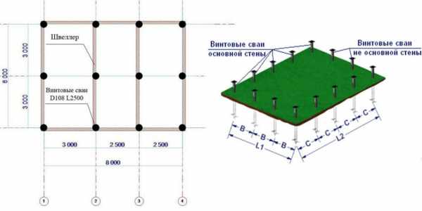 - Расположение винтовых свай, находящихся по углам строения