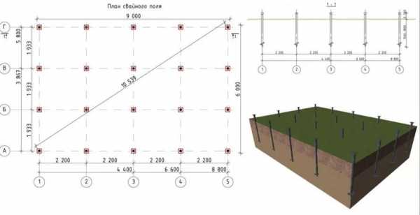 - Сваи с установленным при составлении чертежа равным шагом располагаются по всем несущим строящимся стенам. Их число определяется в зависимости от используемого при конкретном строительстве шага.