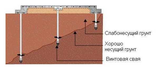- Если при вкручивании сваи попался твердый грунт, скала или другое твердое препятствие, то поступают так: при неглубоком (≥ 1 м) погружении сваи не на углах фундамента ее можно оставить в грунте, обрезав верх до нужной высоты. Если глубина погружения меньше метра, то сваю нужно сместить. По углам фундамента все сваи должны быть вкручены на расчетную глубину;