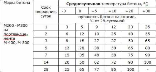 Изображение 1. Таблица времени твердения бетона.