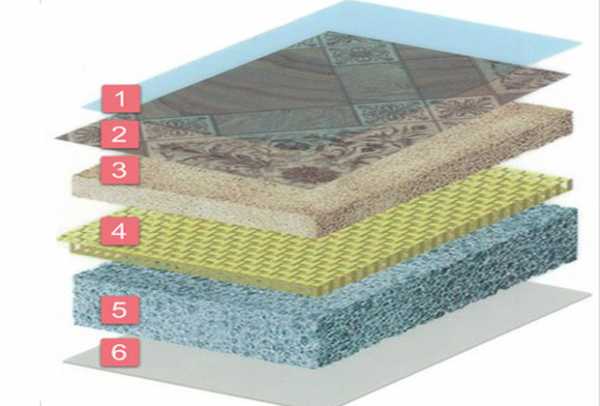 В разрезе такой линолеум представляет собой слоеный пирог толщиной от 1,4 до 3,5 мм.Каждый слой в таком пироге, несет свою функциональную нагрузку: