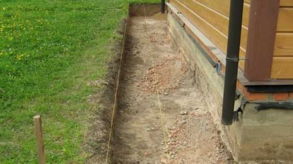 Чтобы выкопать саму траншею, необходимо провести ее разметку. То есть на грунт наносят выше обозначенные параметры. В углах отмостки устанавливают колышки, которые обвязывают бечевкой. И только после этого снимается грунт глубиною, определенной предварительно сделанными расчетами, как показано выше.