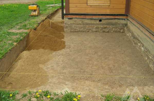 Второй слой «подложки» состоит из слоя песка. Чтобы не повредить пленку, надо хорошо его просеять, это позволит удалить всю крупную фракцию.Сверху гидроизоляционного материала насыпают слой песка толщиной 4-5 см и хорошо его трамбуют.