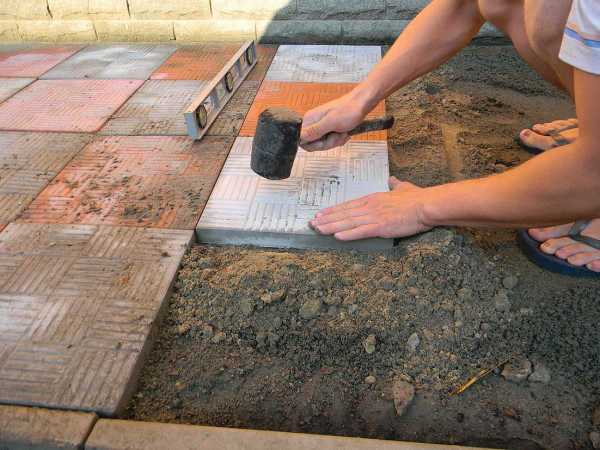 Работа начинается от стены здания, намного удобнее двигаться от себя, так как при этом не нарушается целостность песчано-цементной подушки. Для установки каждого элемента на свое место используется резиновый молоток, при помощи которого выполняется выравнивание по уровню.